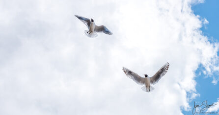 Two Seagulls Flying in Blue Sky. Latvia. Tamron 300mm.