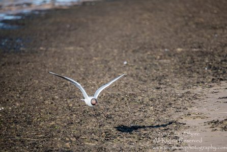 Seagull flying over beach. Tamron 300mm