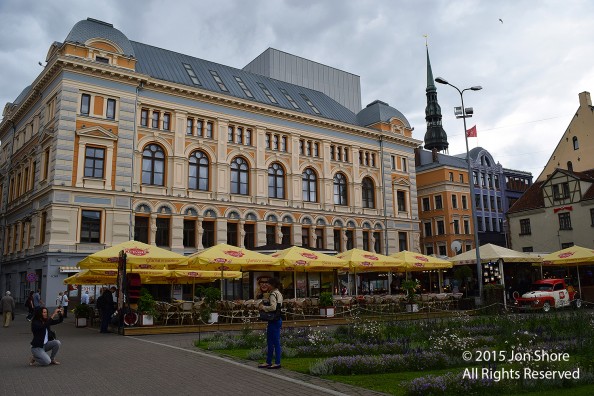 Tourists at the Russian Theater in Riga, Latvia.