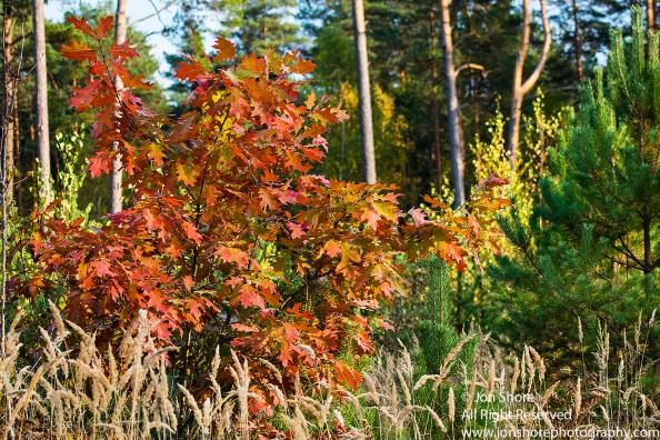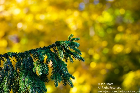Evergreen Tree Branch with Yellow Leaves in Background. Tamron 300mm Lens.
