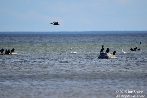 Great Cormorants and Swans on Rocks, Engure, Latvia. Tamron 600mm